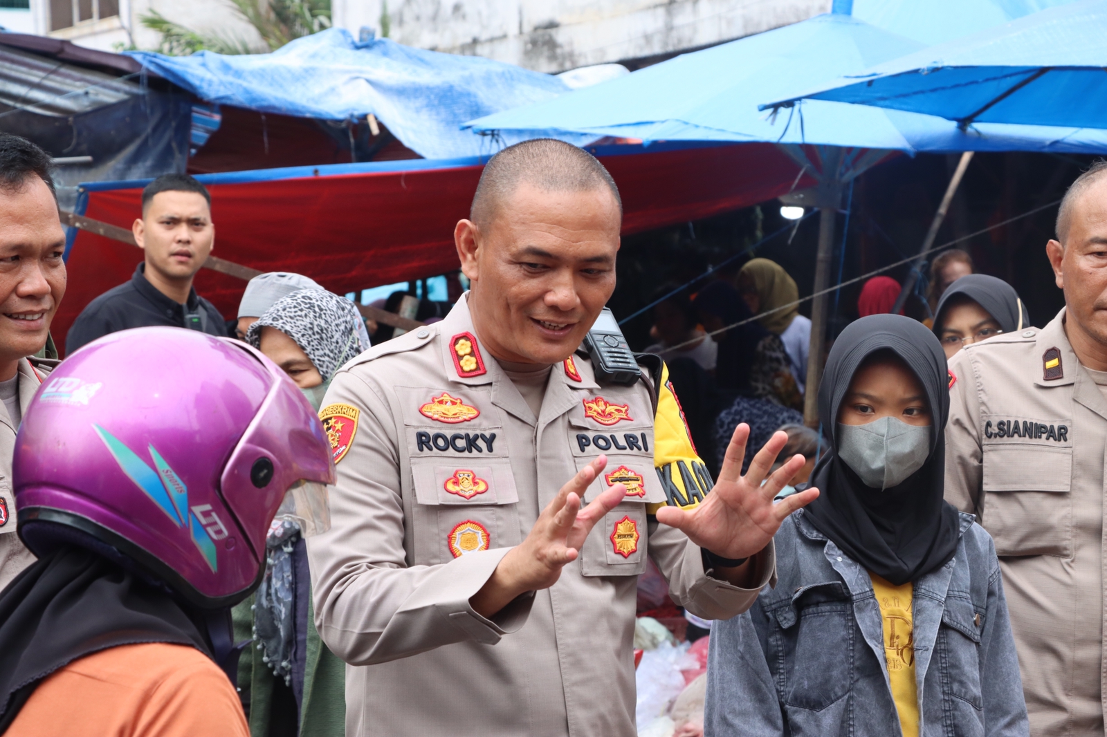 Kapolres Asahan Blusukan Di Pasar Diponegoro Kisaran Menjelang Hari Raya Idul Fitri 1444 H ASAHAN | Guna mendekatkan tubuh institusi polri kepada masyarkat , sekaligus menyerap aspirasi terkait Kamtibmas dan membahas persiapan menjelang Lebaran Idul Fitri 1444 H Tahun 2023 Polres Asahan Gelar Jumat Curhat Di Pasar Diponegoro Kisaran Kabupaten Asahan Jumat (21/04/2023). Kegiatan tersebut dipimpin langsung Kapolres Asahan AKBP Rocky Hasuhunan Marpaung, SH, SIK, MH , didampingi Kasat Binmas AKP FR Saragi SH, Kanit Binmas Ipda Charles Sianipar. Dalam Jumat Curhat tersebut Kapolres melakukan pengecekan perkembangan harga sembako sekaligus bersenda gurau dengan para pedagang. “Harapan kita harga sembako tetap…