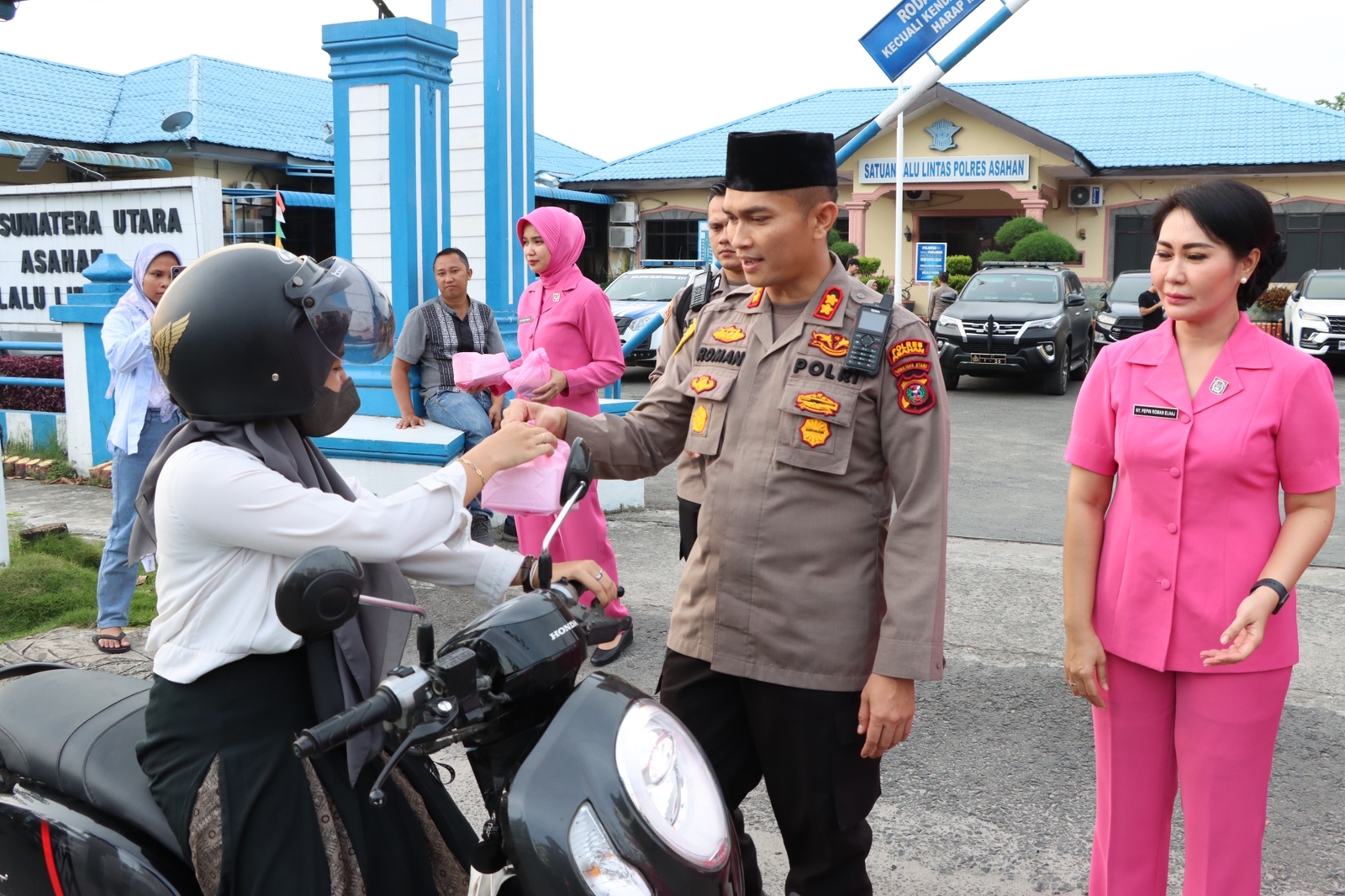 Bersama Ketua Bhayangkari, Kapolres Bagikan Takjil di Depan Satlantas Polres Asahan ASAHAN | Saat menjelang berbuka puasa, dengan ketua Bhayangkari Cabang Asahan Ny Pepin Roman Elhaj, dan Kapolres Asahan AKBP Roman Smaradhana Elhaj, SH, SIK, MH Beserta jajaran melalukan kegiatan memberikan takjil kepada penguna jalan di jalan Cokroaminoto Kisaran Jumat sore (31/03/2023). Kapolres Asahan dan Ketua Bhayangkari langsung turun kelokasi menyasar warga lewat dengan membagikan paket takjil di depan Kantor Satlantas Polres Asahan. Tampak juga Kasat Lantas Polres Asahan AKP Galih Hariomursyid dan para ibu-ibu Pengurus Bhayangkari Cabang Asahan beserta Personel Satlantas Polres Asahan turut membagikan Takjil. Kapolres Asahan AKBP…