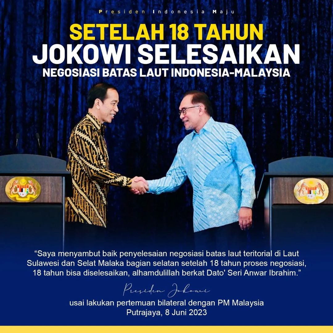 JST-News.com – Presiden Joko Widodo “Saya menyambut baik penyelesaian negosiasi batas laut teritorial di Laut Sulawesi dan Selat Malaka bagian selatan setelah 18 tahun proses negosiasi, 18 tahun bisa diselesaikan, alhamdulillah berkat Dato’ Seri Anwar Ibrahim,” Presiden Joko Widodo Usai lakukan pertemuan bilateral dengan PM Malaysia, Putrajaya, 8 Juni 2023 ( Sukindar)