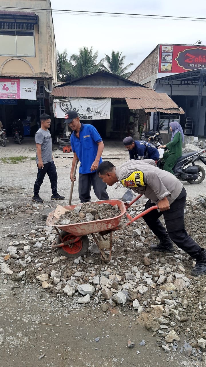Bersama warga Bhabinkamtibmas Polsek Bandar Pulau Timbun Jalan Berlubang
