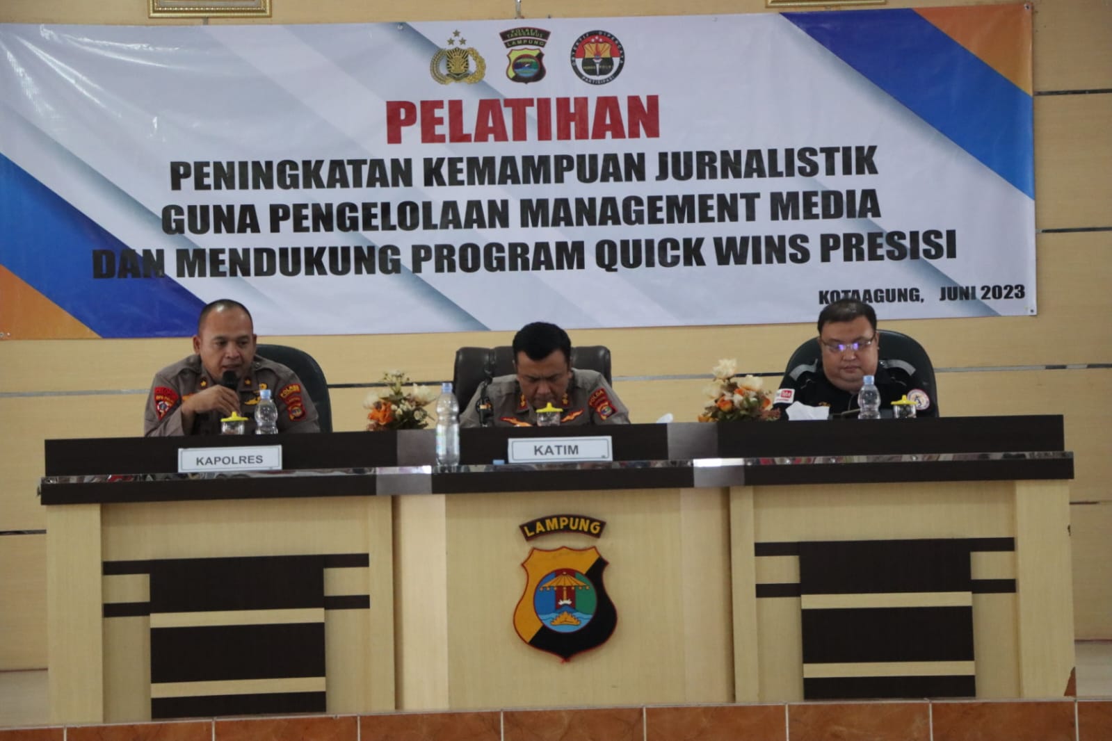 Jst-news.com Tanggamus Polres Tanggamus menggelar pelatihan kemampuan jurnalistik yang diinisiasi oleh Bidang Humas Polda Lampung di Aula Paramasatwika, Selasa 6 Juni 2023. Kegiatan dibuka oleh Kasubbid Penmas Bid Humas Polda Lampung, AKBP Rahmad Hidayat, S.E., M.M bersama Kapolres Tanggamus AKBP Siswara Hadi Chandra, S.I.K serta pemateri Amirudin Sormin yang berasal dari PWI Lampung. Peserta pelatihan meliputi para kasat, perwakilan satuan kerja (Satker) Polres, para Kapolsek dan dua orang perwakilan Bhabinkamtibmas Polsek Jajaran Polres Tanggamus. Kapolres AKBP Siswara Hadi Chandra dalam sambutannya mengatakan bahwa, pelatihan dengan tema “Peningkatan Kemampuan Jurnalistik Guna Pengelolaan Guna Pengelolaan Media dan Mendukung Quick Wins Presisi, tersebut…
