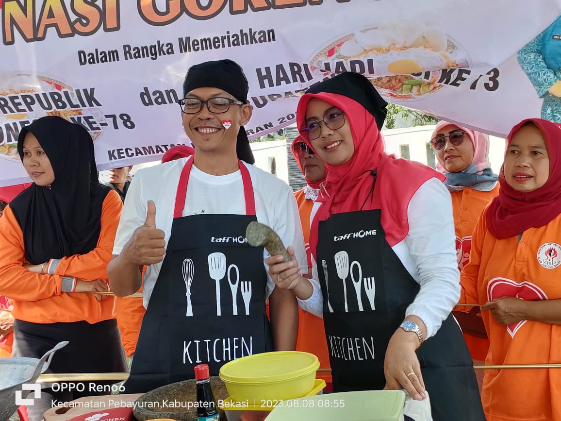 JST-NEWS BEKASI | Sambut Hari Kemerdekaan RI ke 78 Ada hal unik dan menarik yang dilakukan Muspika Kecamatan Pebayuran Danramil 11 Pebayuran Kapten CHB Ibrohim bersama Camat Hasim Adnan Adha menggagas lomba memasak nasi goreng yang di ikuti 18 Team dari masing-masing desa dan Kelurahan Sekecamatan Pebayuran Kegiatan lomba memasak nasi goreng tersebut berlangsung di Halaman Kantor Kecamatan Pebayuran Kabupaten Bekasi Selasa 8/8/2023. Danramil 11 Pebayuran Kapten CHB Ibrohim saat di wawancarai awak media mengaku melalui lomba nasi goreng dirinya ingin mempromosikan konsep ketahanan pangan, urban farming, keseimbangan gizi makanan,” Kata Danramil Camat Pebayuran Hasim Adnan Adha saat membuka kegiatan…