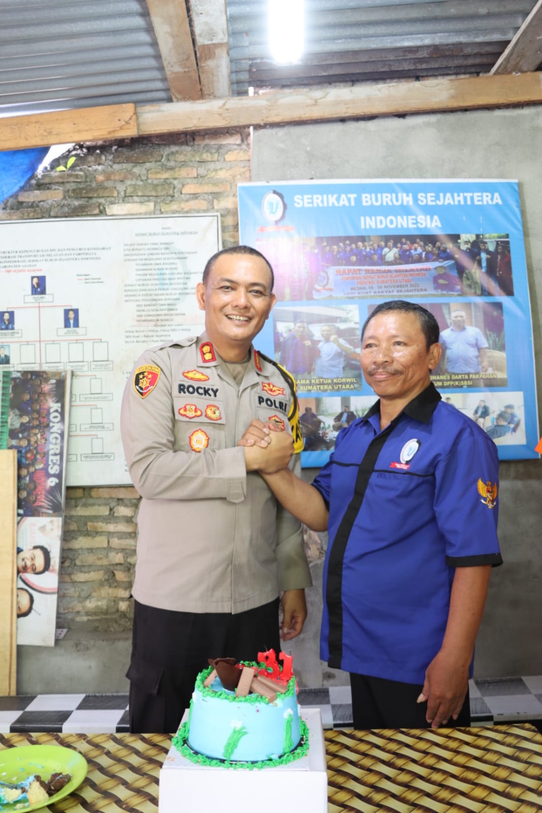 Kapolres Asahan Berikan Kue Ultah Kepada SBSI Asahan Di Peringatan May Day ASAHAN | Kapolres Asahan AKBP Rocky H Marpaung, SH, SIK, MH beserta para Pejabat Utama Polres Asahan menyerahkan kue ulang tahun sekaligus ucapan selamat kepada Serikat Buruh Sejahtera Indonesia (SBSI) dalam rangka Peringatan Hari Buruh Internasional Tahun 2023, Senin (01/05/2023). Dalam peringatan Hari Buruh Internasional atau biasa disebut May Day yang berlangsung Kantor Serikat Buruh Sejahtera Indonesia (SBSI) Jalan Veteran Kelurahan Kisaran Barat Kecamatan Kota Kisaran Barat Kabupaten Asahan ini mendapatkan kejutan dari Kapolres Asahan AKBP Rocky H Marpaung, SH, SIK, MH beserta para Pejabat Utama Polres Asahan….