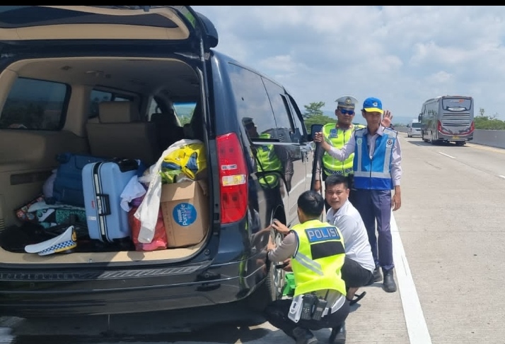 Tim Urai Sat Lantas Polres Kendal Sigap Bantu Pemudik Yang Alami Pecah Ban di Tol KM 400
