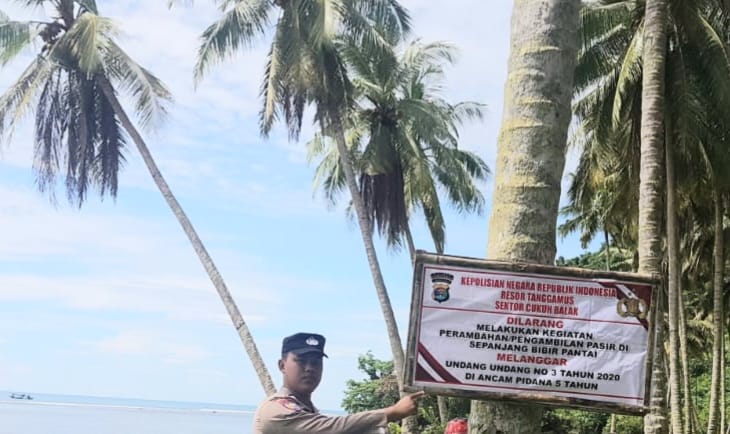 Jst-news.com Tanggamus langkah pencegahan terhadap aksi penambangan ilegal pasir laut, Polsek Cukuh Balak pasang papan informasi larangan melalui pemasangan Banner di pesisir 2 pantai di Kecamatan setempat serta memberikan teguran kepada masyarakat, Rabu 15/03/2023. Kapolsek Cukuh Balak IPDA Adi Setiawan, yang mewakili Kapolres Tanggamus AKBP Siswara Hadi Candra S.I.K menegaskan, pemasangan banner tentang pelarangan pengambilan pasir laut dilakukan di Pekon Tanjung Betuah Pekon Banjarmanis dan Pekon Tengor Kecamatan Cukuh Balak. Itu merupakan Sebagai upaya untuk mencegah warga agar tidak melakukan penambangan pasir di area pantai tersebut, maka kami memasang papan informasi larangan, tegasnya. dampak negatif yang diperoleh dari penambangan pasir…