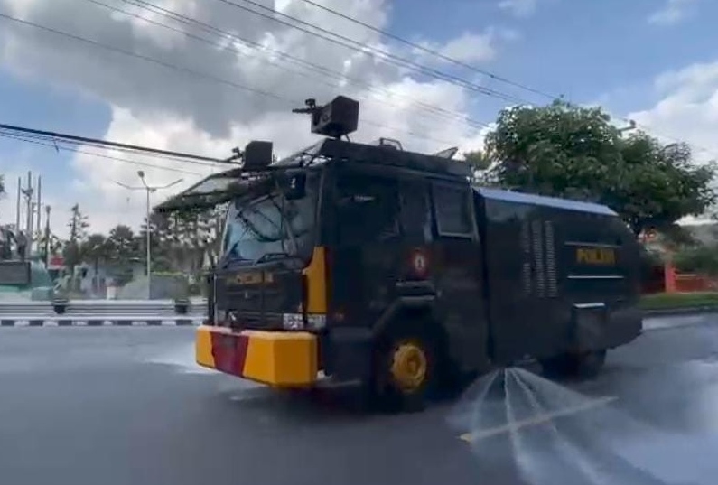 Kerahkan Water Canon, Polres Temanggung Semprot Abu Vulkanik Di Ruang Publik