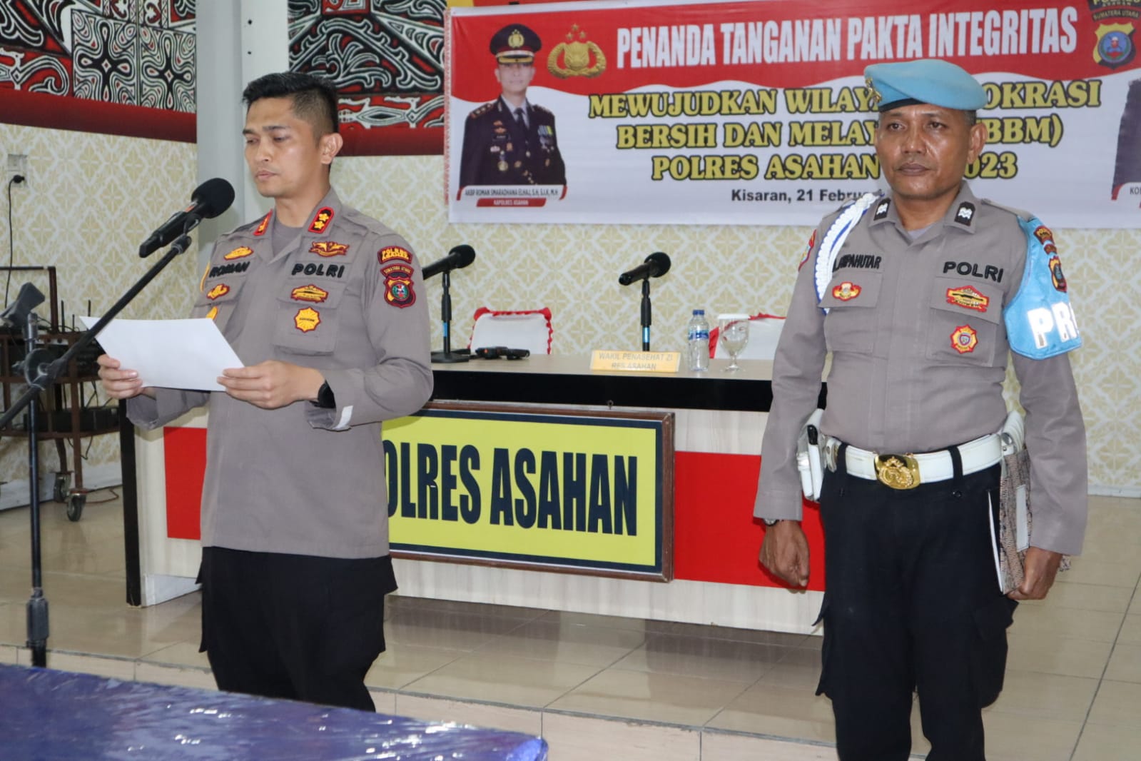 Kapolres Asahan Laksanakan Kegiatan Penanda Tanganan Pakta Integritas WBBM 2023 ASAHAN | AKBP Roman Smaradhana Elhaj, SH, SIK, MH melaksanakan Penandatanganan Pakta Integritas dan Komitmen Integritas kepada pejabat kepolisian. Pejabat yang melakukan tandatangan mulai Kabag Ops Polres Asahan,Kabag SDM,Kabag Ren,Kasat Intel,Kasat Reskrim,Kasat Samapta,Kasikeu,Kasat Lantas,Kasi TIK,Kasium dan Kasihumas Polres Asahan,Di Lingkungan Polres Asahan, kegiatan berlangsung di Ruang Aula Wira Satya Polres Asahan, Selasa (21/2/2023). “Bahwa Penerapan penandatanganan pakta integritas dalam penyelengaraan program kerja Kepolisian Resor Asahan merupakan langkah untuk memastikan bahwa aparatur Kepolisian sanggup untuk melaksanakan tugas dan tanggung jawabnya serta peran dan wewenangnya sesuai dengan peraturan perundang-undangan,” ungkap Kapolres Asahan…