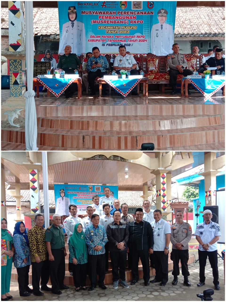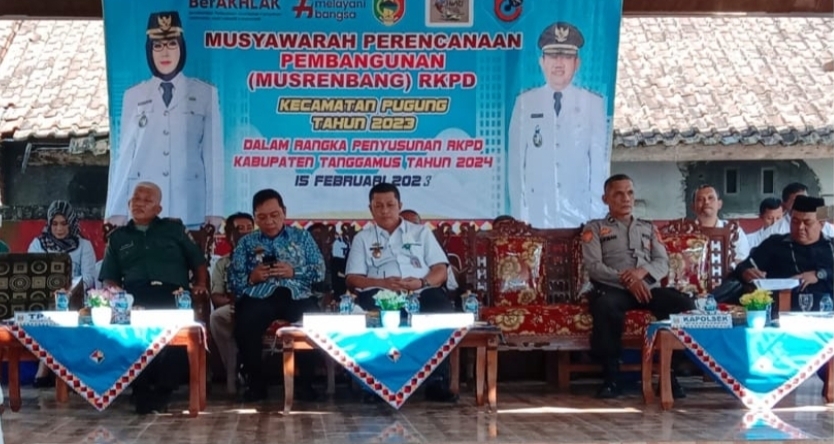 JT-NEWS. Tanggamus Lampung.Laksanakan Musyawarah Rencana pembangunan (Musrenbang) tahun 2023, guna pemantapan sumber daya manusia yang berdaya saing dalam rangka meningkatkan Pembanguanan Sekala prioritas Terpenting, kegiatan berlangsung di gedung aula Kecamatan Pugung pada Rabu(15/02/2023). Kegiatan tersebut di hadiri Hendra Wijaya yang mewakili Kabupaten Tanggamus, Ahmad Yani camat pugung beserta jajarannya, Anggota praksi PDIP, Kapolsek pugung yang mewakili, Danramil, ketua panwas kecamatan, Anggota DPRD, kepala pekon sekecamatan pugung, PKK, Tokoh masyarakat, organisasi perangkat daerah (OPD). Hendra Wijaya menyampaikan, Musrenbang ini merupakan agenda Tahunan dimana warga saling bertemu berdiskusi tentang apa yang mereka hadapi, Kemudian diusulkan kepada pemerintah di level yang lebih tinggi,…