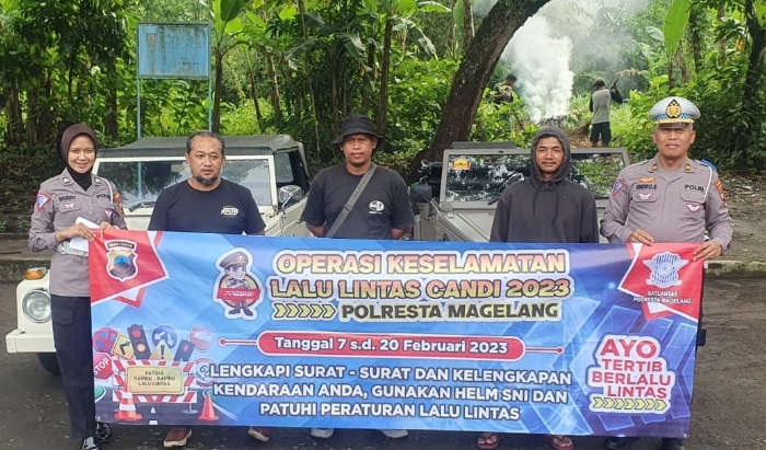 Jst-news.com |Magelang- Dalam pelaksanaan Operasi Keselamatan Lalu Lintas Candi (OKLLC) tahun 2023, Polresta Magelang lakukan sosialisasi serta himbauan ke berbagai kalangan masyarakat baik individu maupun kelompok. Seperti yang dilakukan Iptu Endro Suryanto selaku Sub Satgas Dikmas Lantas OKLLC memberikan sosialisasi serta himbauan kepada komunitas pengemudi VW di area tempat wisata kolam renang Dusun Karet Kelurahan Mendut Kecamatan Mungkid Kabupaten Magelang, pada Sabtu (18/2/2023). Menghampiri para pengemudi VW yang sedang mangkal, Iptu Endro Suryanto bersama anggotanya membagikan brosur OKLLC/ 2023 yang bertuliskan tentang himbauan untuk tertib berlalulintas. “Sebagai komunitas kendaraan VW harus bisa memberi contoh yang baik tertib dalam berlalu lintas…